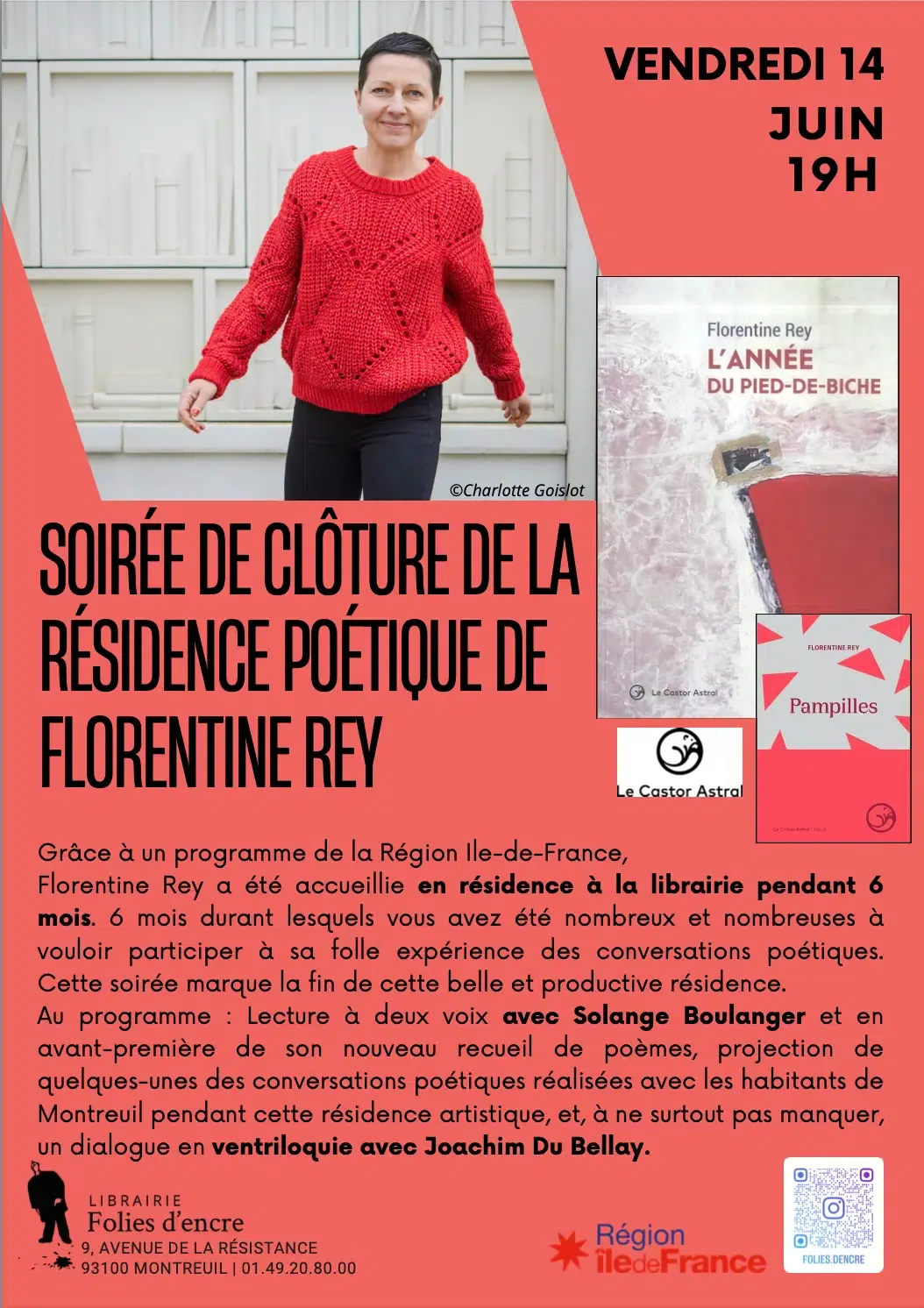Au programme : courte lecture d’extraits du prochain recueil de Florentine, projection de quelques conversations poétiques menées avec les habitants (dont la votre) et numéro de ventriloquie avec Joachim Du Bellay. La soirée dure une petite heure et elle est animée par Jean-Marie Ozanne.