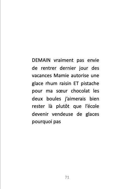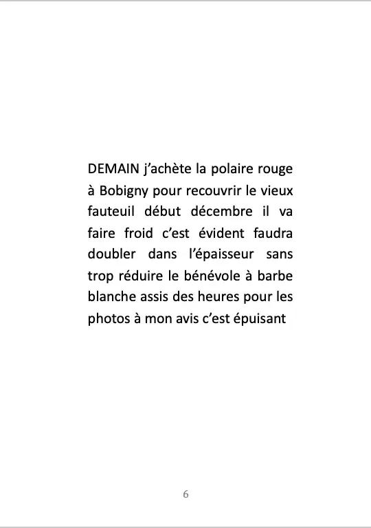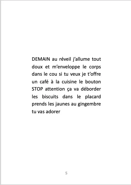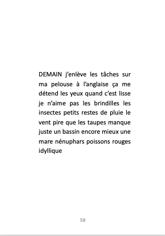 Pendant quatre ans, dans le cadre de résidences d’écriture, j’ai demandé aux gens ce qu’ils allaient faire demain. J’ai récupéré leurs écrits et paroles comme une matière première que j’ai secouée, transformée, une pâte à modeler. Demain ne se passera pas comme prévu mais du bouleversement naît la poésie.