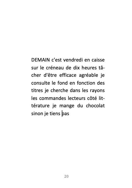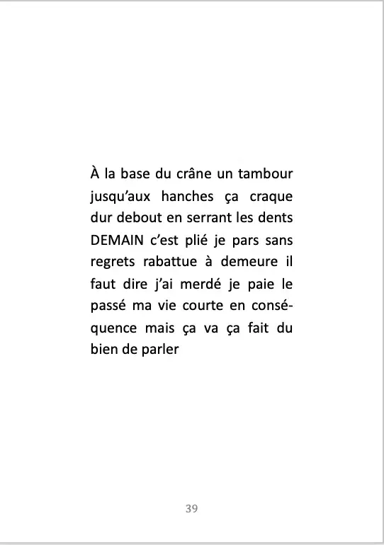 Florentine Rey donne voix aux futurs à travers des carrés de mots centrés dans la page. Les poèmes sont comme des écrans qui projettent des horizons tantôt joyeux, tantôt empreints d’angoisses et de nécessités, tous tenus par un élan vital. L’écriture semble guidée par la nécessité d’une réconciliation entre l’intime et le dehors. L’autrice travaille le rythme et bouleverse la syntaxe pour faire naître l’émotion. La lecture se fait comme un branchement, le texte s’allume et le courant passe à travers les mots.