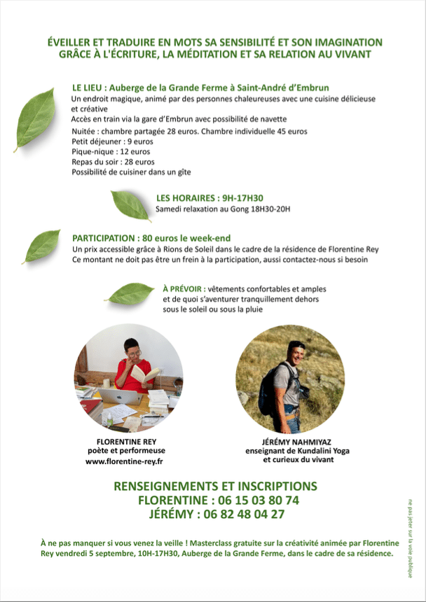 A ne pas manquer si vous venez la veille ! Master class gratuite sur la créativité animée par Florentine Rey vendredi 5 septembre, 10H-17H, Auberge de la petite grande ferme, dans le cadre de sa résidence.