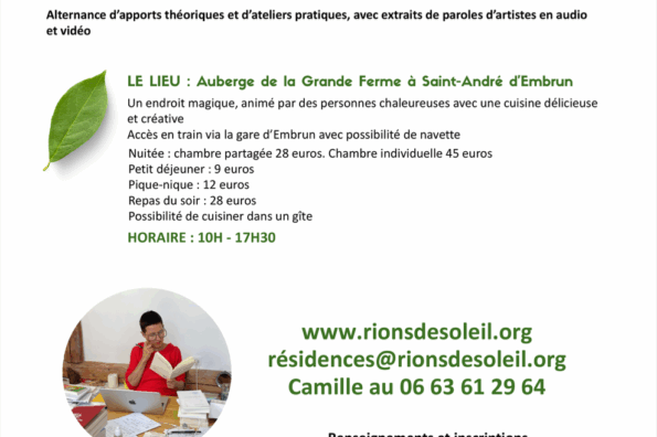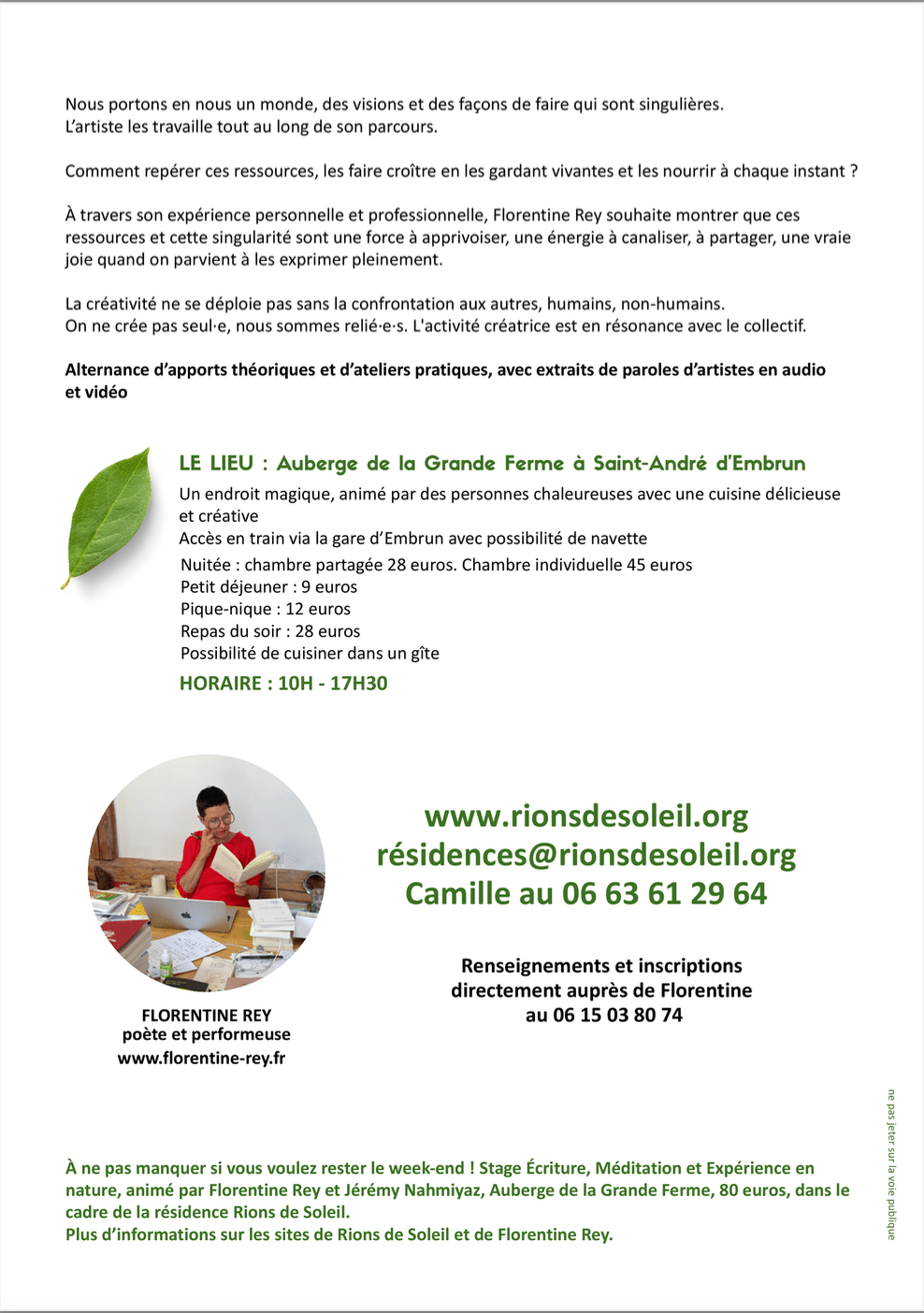 À ne pas manquer si vous voulez rester le week-end ! Stage Écriture, Méditation et Expérience en nature, co-animé par Florentine Rey et Jérémy Nahamiyaz, Auberge de la Grande Ferme, 80 euros, dans le cadre de la résidence Rions de Soleil.
