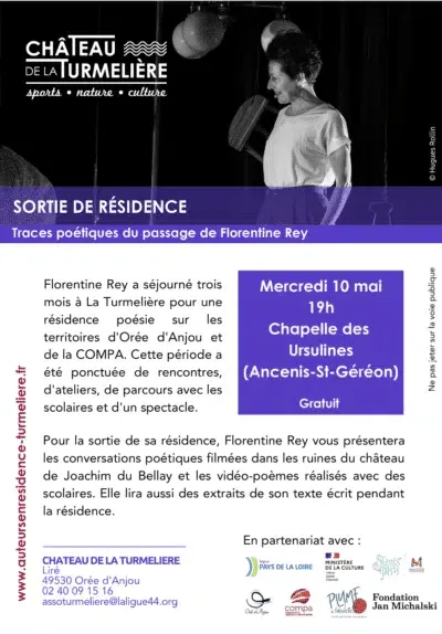 Florentine Rey a séjourné trois mois à La Turmelière pour une résidence poésie sur les territoires d’Orée d’Anjou et de la COMPA. Cette période a été ponctuée de rencontres, d’ateliers, de parcours avec les scolaires et d’un spectacle.