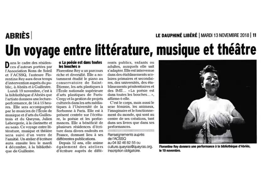 Un voyage entre littérature, musique et théâtre, article paru le mardi 13 novembre 2018 dans le Dauphiné Libéré